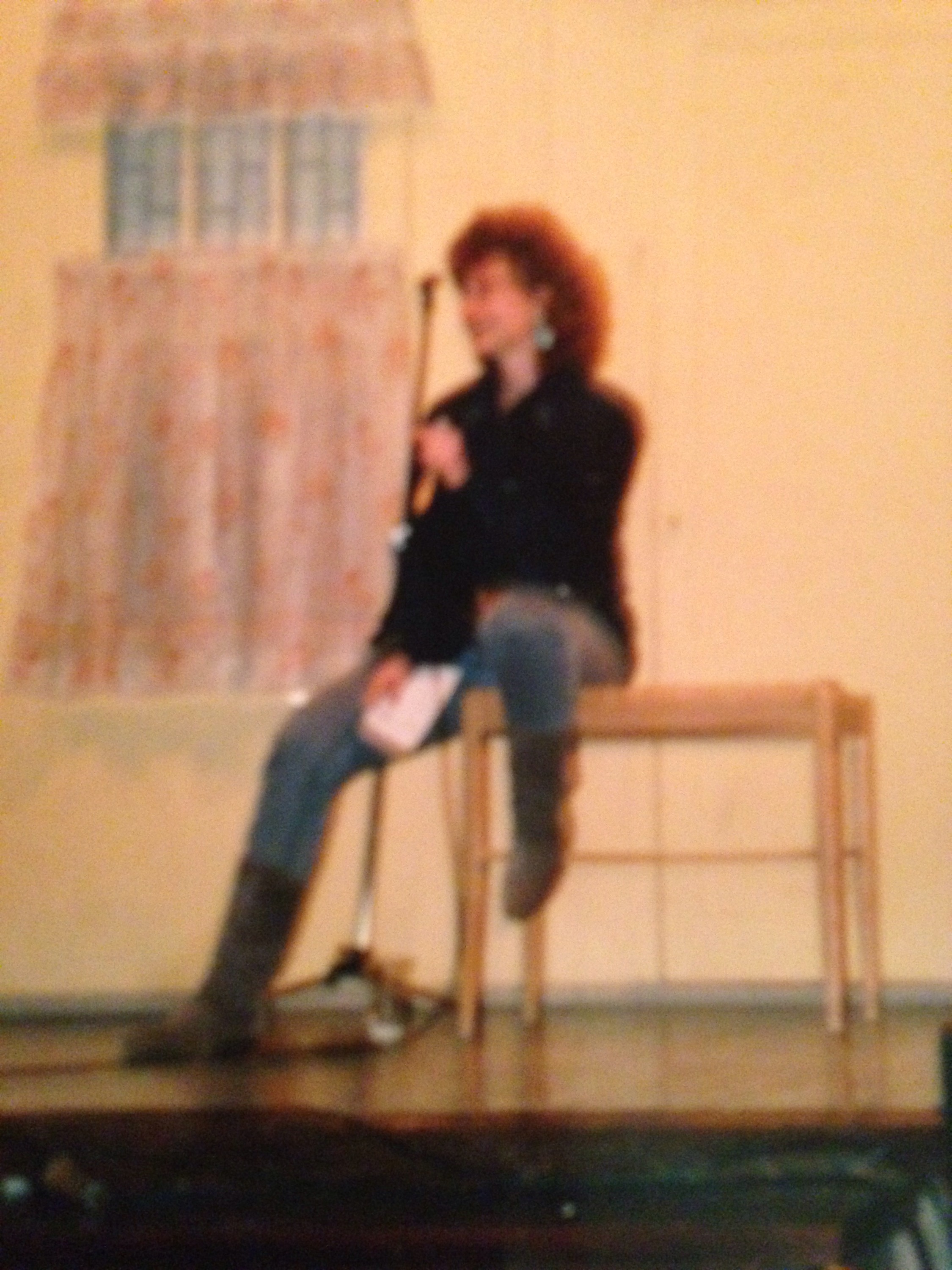 My Grandma, a small, soft, round, sweet-faced woman, was sitting on a wooden folding chair with her cane between her knees. She held it like a scepter, or pointed with it, as we did now, for emphasis.